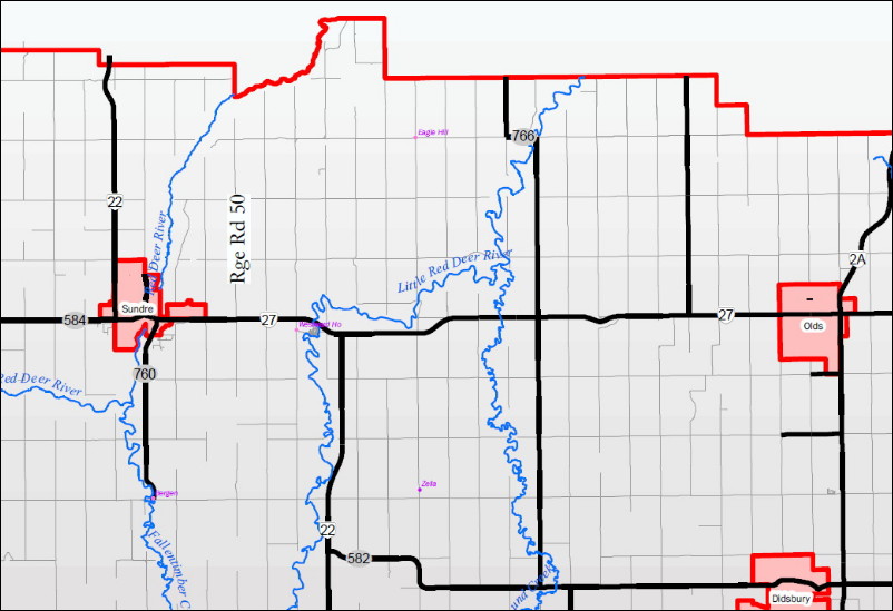 | Location Good Stuff Storage is located northwest of Calgary, or southwest of Red Deer, near Sundre, Alberta. Sundre is a scenic town with lots of outdoor recreational activities, and has an urban and rural population of about 5,000 -- with all major services. Our facility is located 2 miles east of Sundre on Highway 27, to Range Road 50, then 1 mile north. (Driveway 33108). From the QEII Highway (Highway 2), go west through Olds on Highway 27. It is approximately 20 minutes to RR 50, then go north one mile. Our facility is: